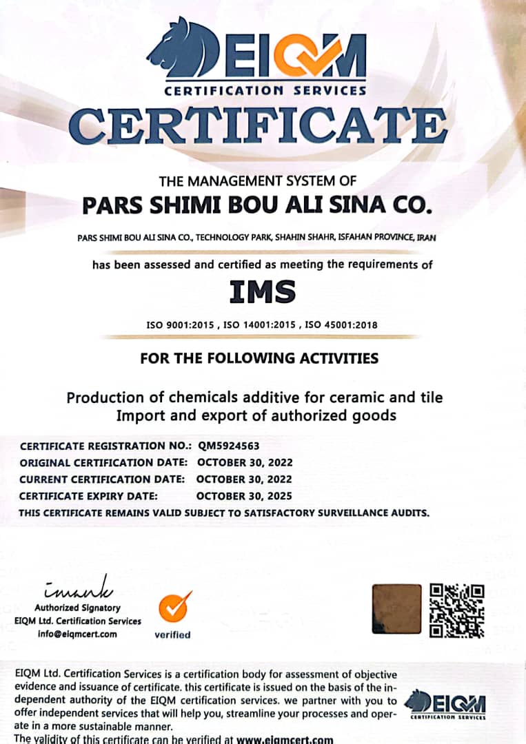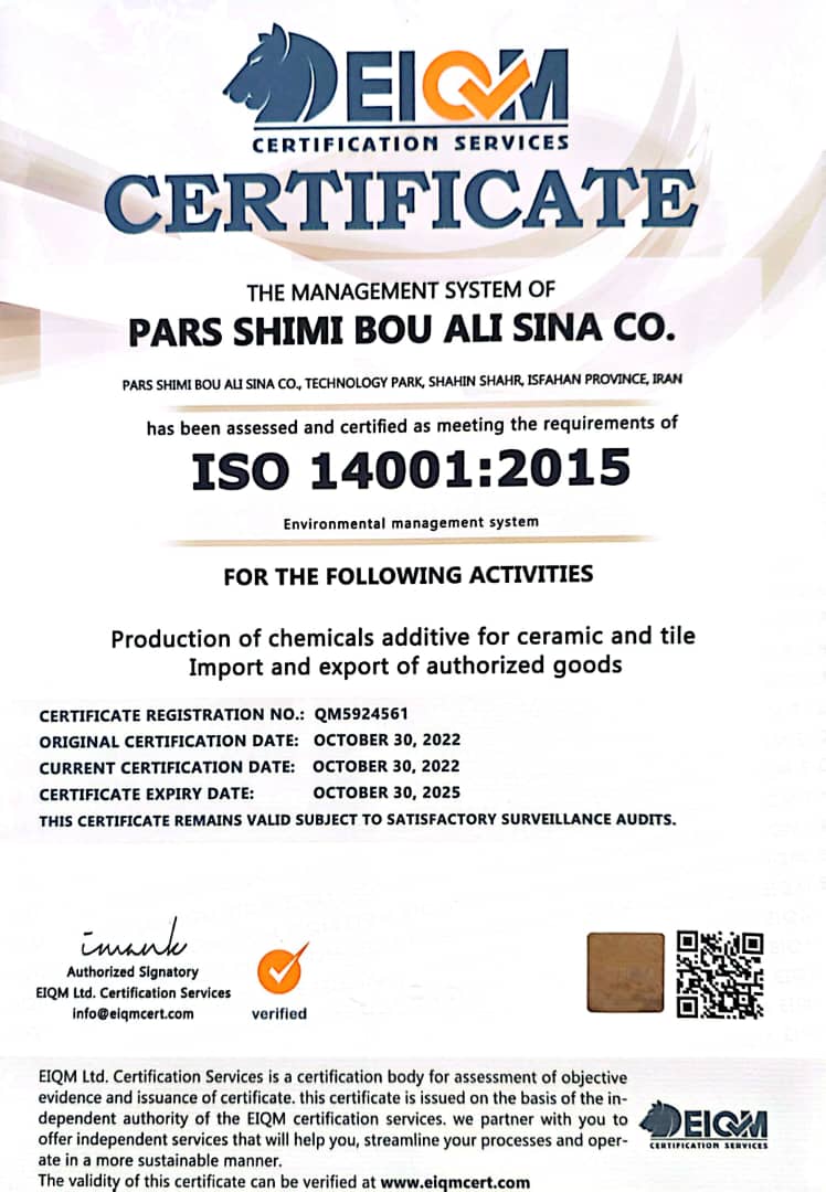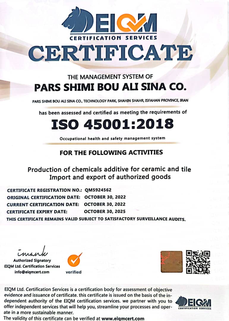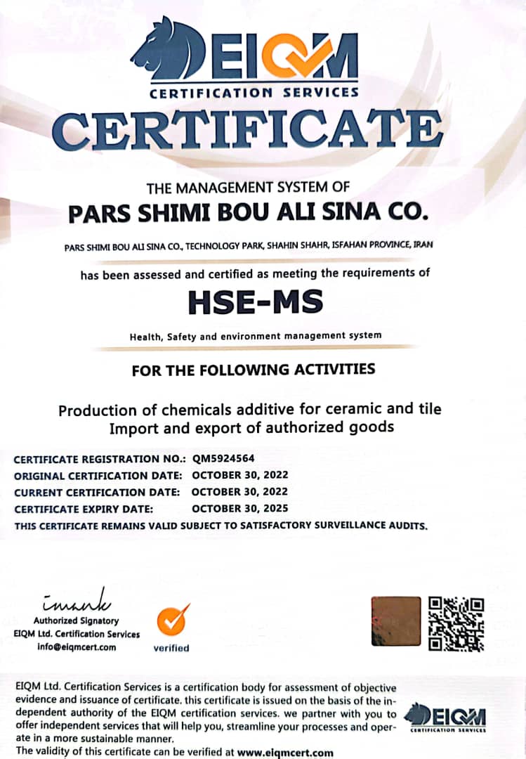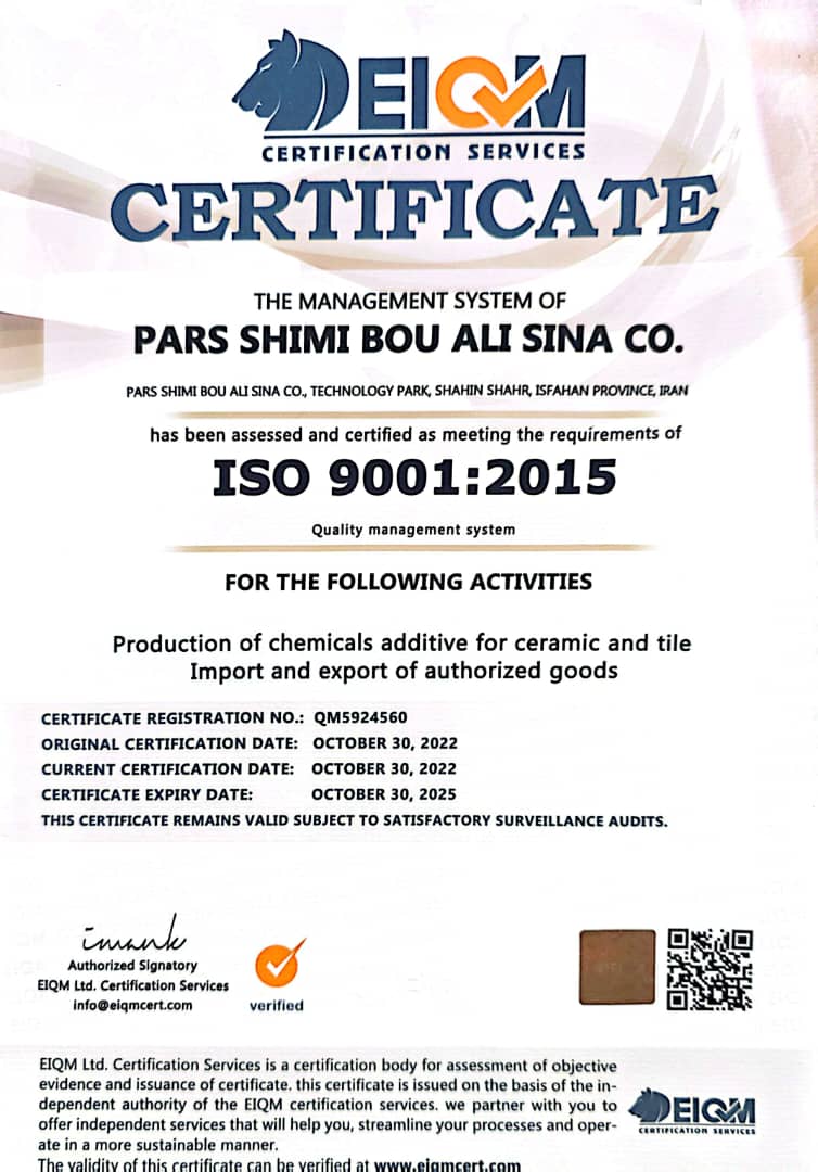شرکت تولیدی بازرگانی پارس شیمی بوعلی سینا ، مستقر در شهرک فناوری اصفهان ، در سال 1391 به همت مدیر عامل مجموعه و بهره گیری از دانش و تجربه ی اساتید عالی رتبه در رشته ی خاک ، عمران و شیمی ،و همچنین کارشناسان مجرب در زمینه خاک و کاشی سازی پس از تحقیقات فراوان در زمینه ی خاک و ارائه ی پایان نامه ی دانشگاهی در این راستا، به ثبت رسیده و شروع به فعالیت در زمینه ی تولید مواد روانساز مصرفی در کارخانه های کاشی و سرامیک مستقر در استانهای یزد ، اصفهان ، خراسان،کرمان و .. نموده است.
